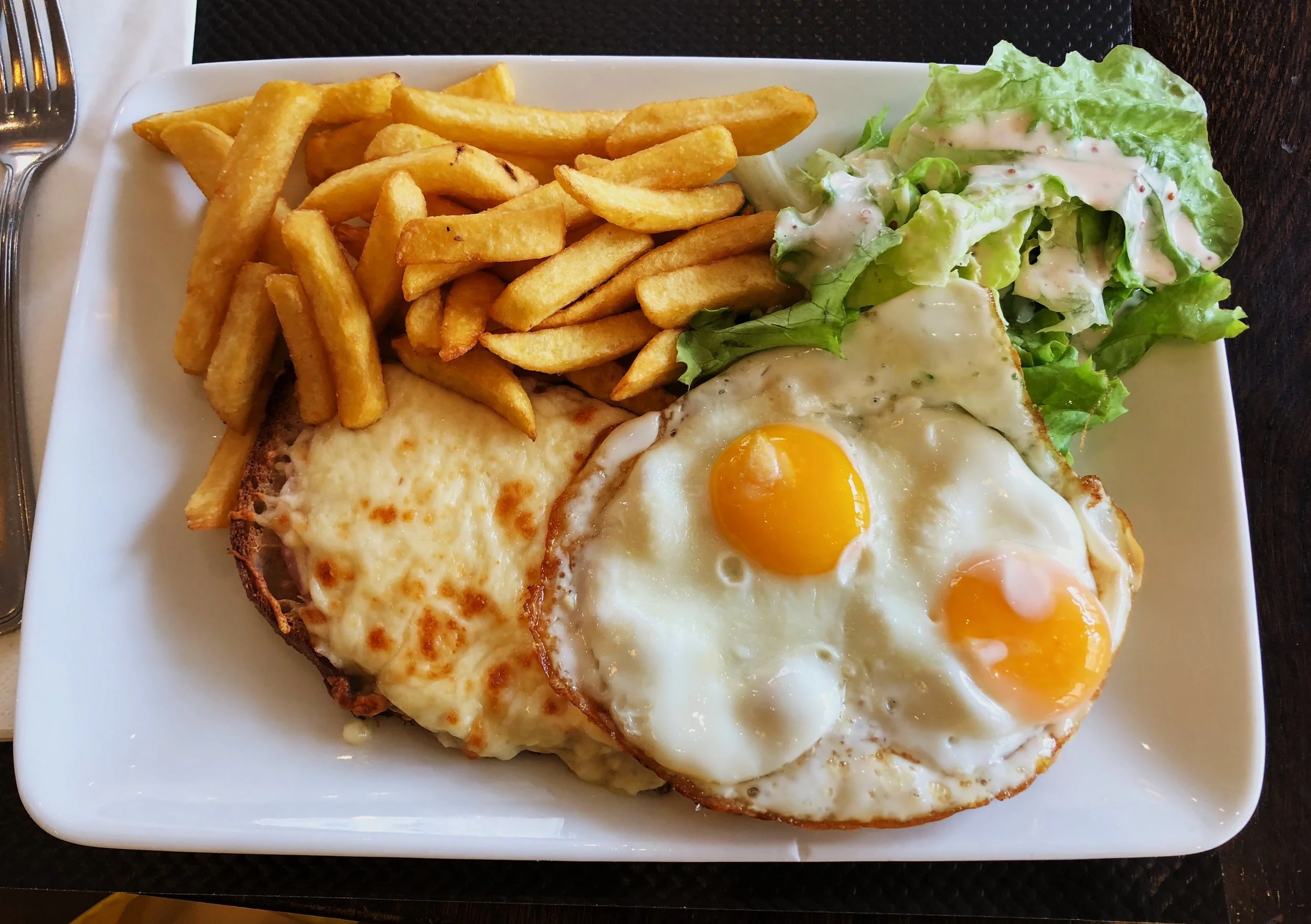 Ordering a traditional Croque Madame. Simply put a grilled cheese with ham in the middle and a fried egg on top.
